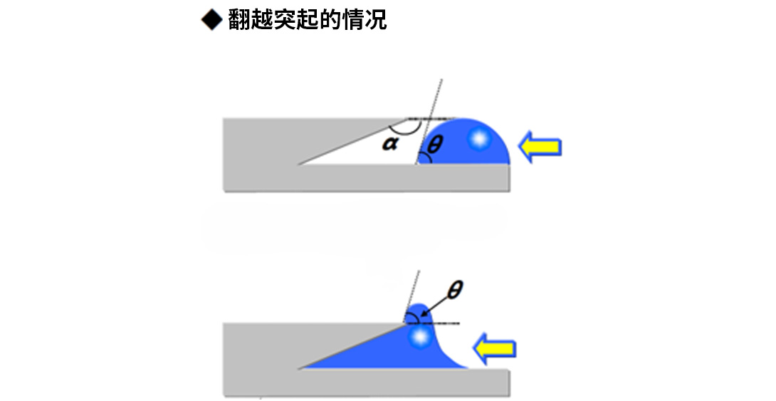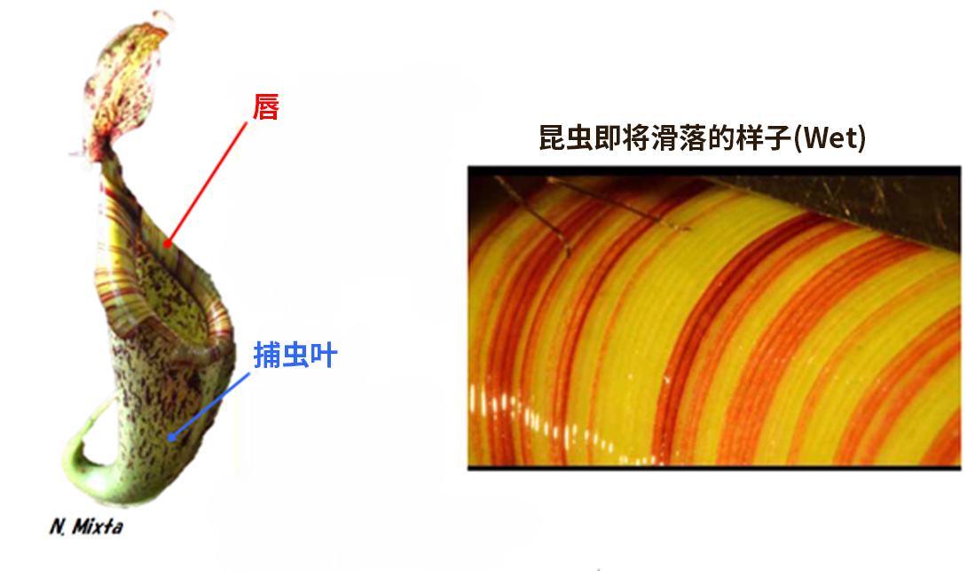 从唇部的内侧向外侧滴水时,水会顺畅地流走。然而,从反方向滴水时,水会受到阻碍难以流动。也就是说,猪笼草的唇部使得水易于向一个方向流动,而相反方向则难以流动。