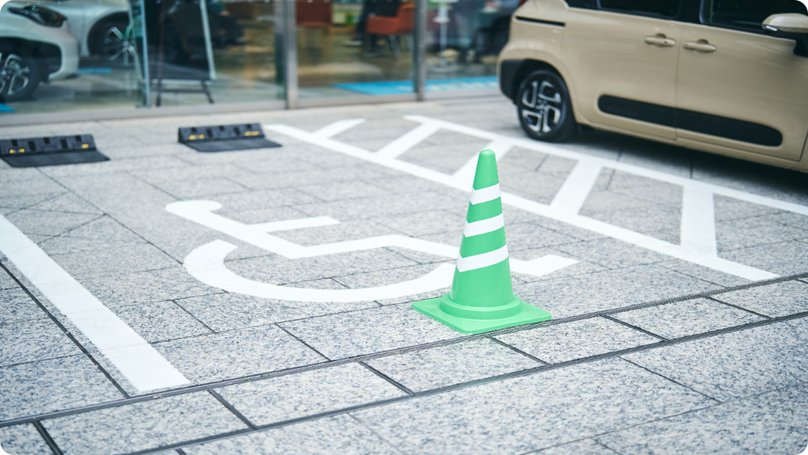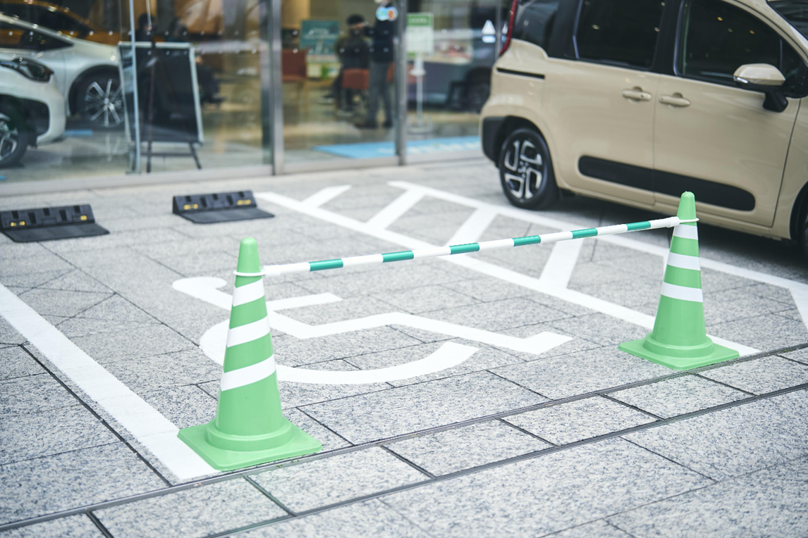 “为了确保轮椅使用者有停车位”,人们出于这份善意设置了锥桶,它有什么问题呢?请看下一页铃木选手上下车的演示视频,您就知道答案了。