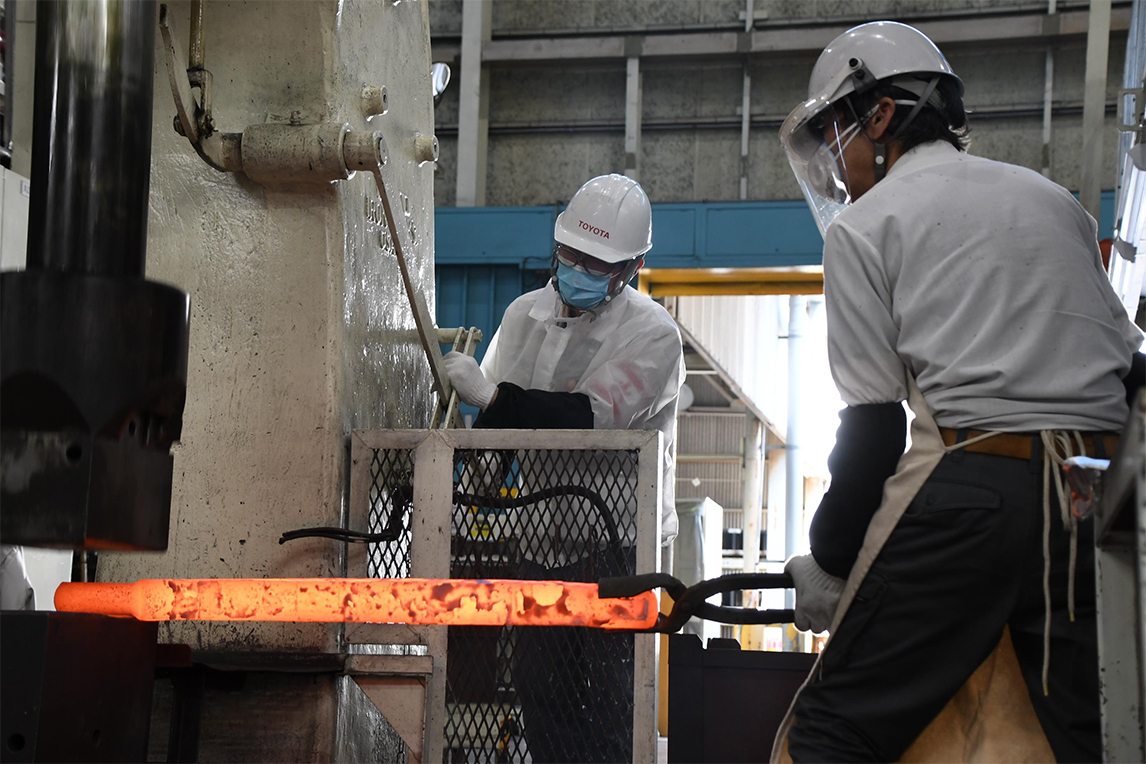 理研锻造将用丰田公司内部制作的10根弯曲锻件,与前篇中介绍的锻模进行成品锻造。若非所有工序都在本公司内完成,在试制与调整上就会减少许多灵活性,导致无法确保成品质量。而理研锻造听到真部他们的造物理念后表示认同,因此提出了合作邀请。